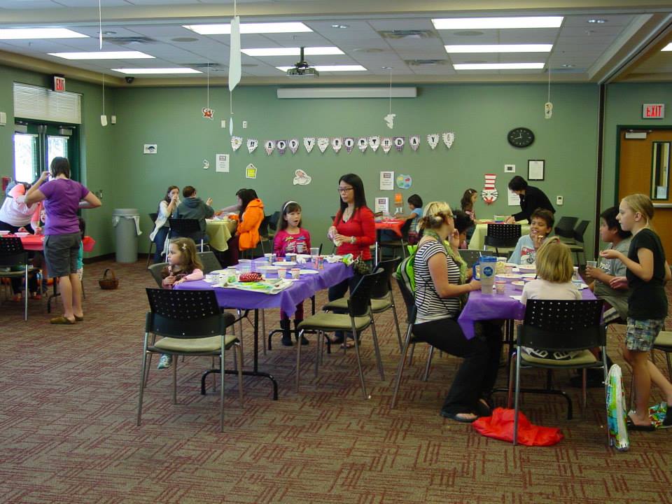 Once you’ve amassed your horde of attendees, they have to have something to DO. So set up stations around the room with unique, book-themed activities. At our Dr. Suess Bash, we had a crafting stations where kids could make a Cat in the Hat decoration, a Fox in Sox puppet, or color a red fish/blue fish bowl. At our “Fantastic Food” station, they decorated Seuss-style cookies and made fruit loop necklaces. At our game station, they played Thidwick Moose ring toss (where they tried to get the rings on his antlers). Finally, we had a Thing One and Thing Two picture station where kids could pose with their friends.