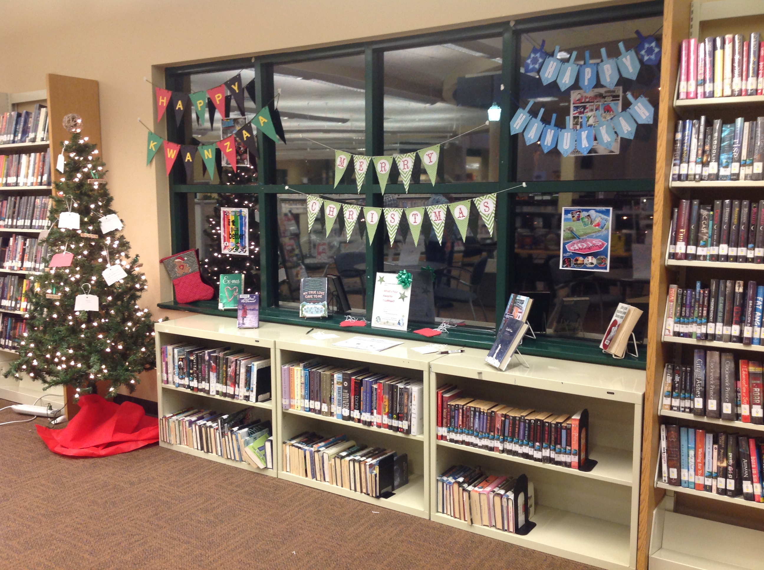 So I was determined this holiday season to incorporate not just Christmas books but Hanukkah and Kwanzaa titles into my book display.